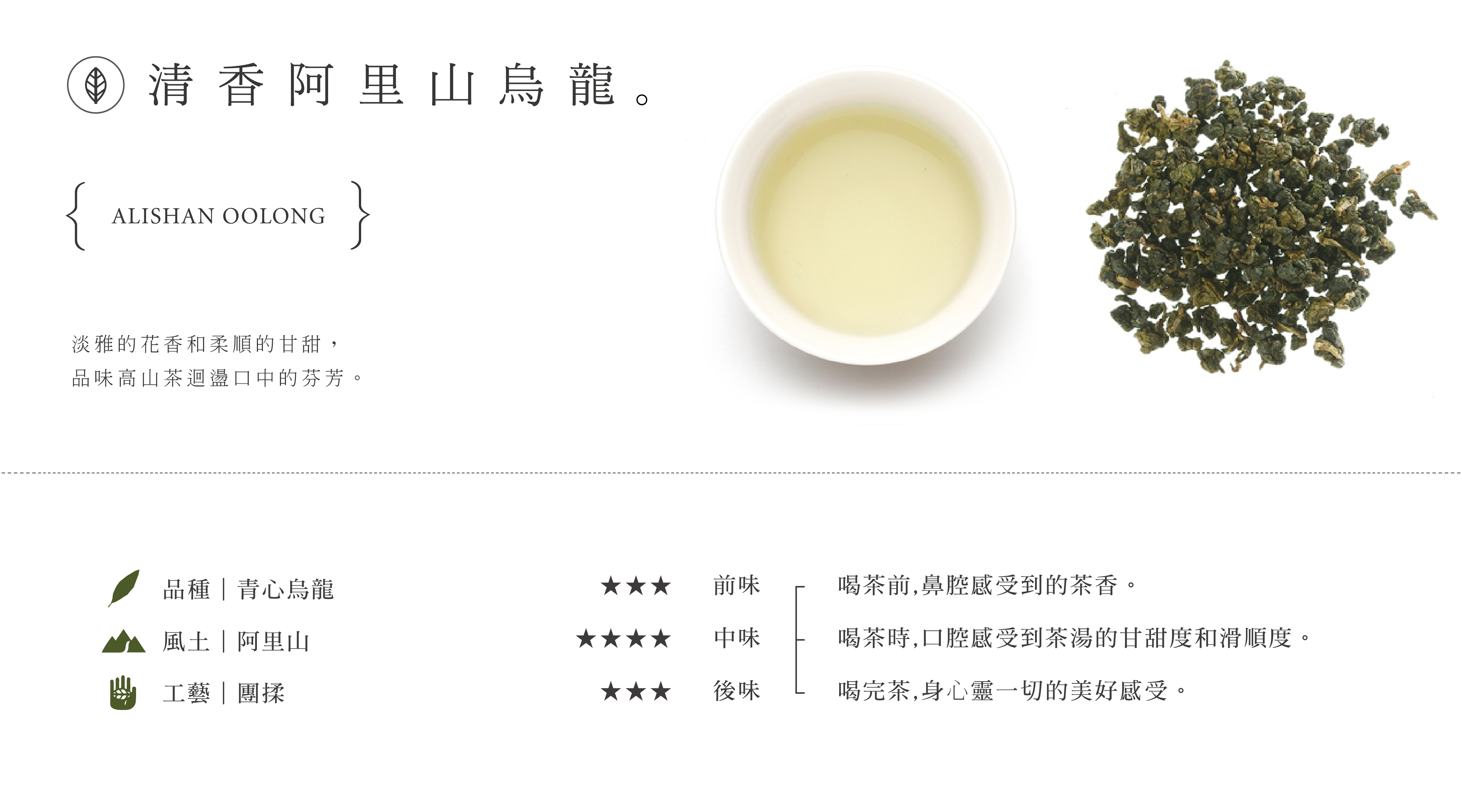 淡雅的花香和柔順的甘甜,品味高山茶迴盪口中的芬芳。