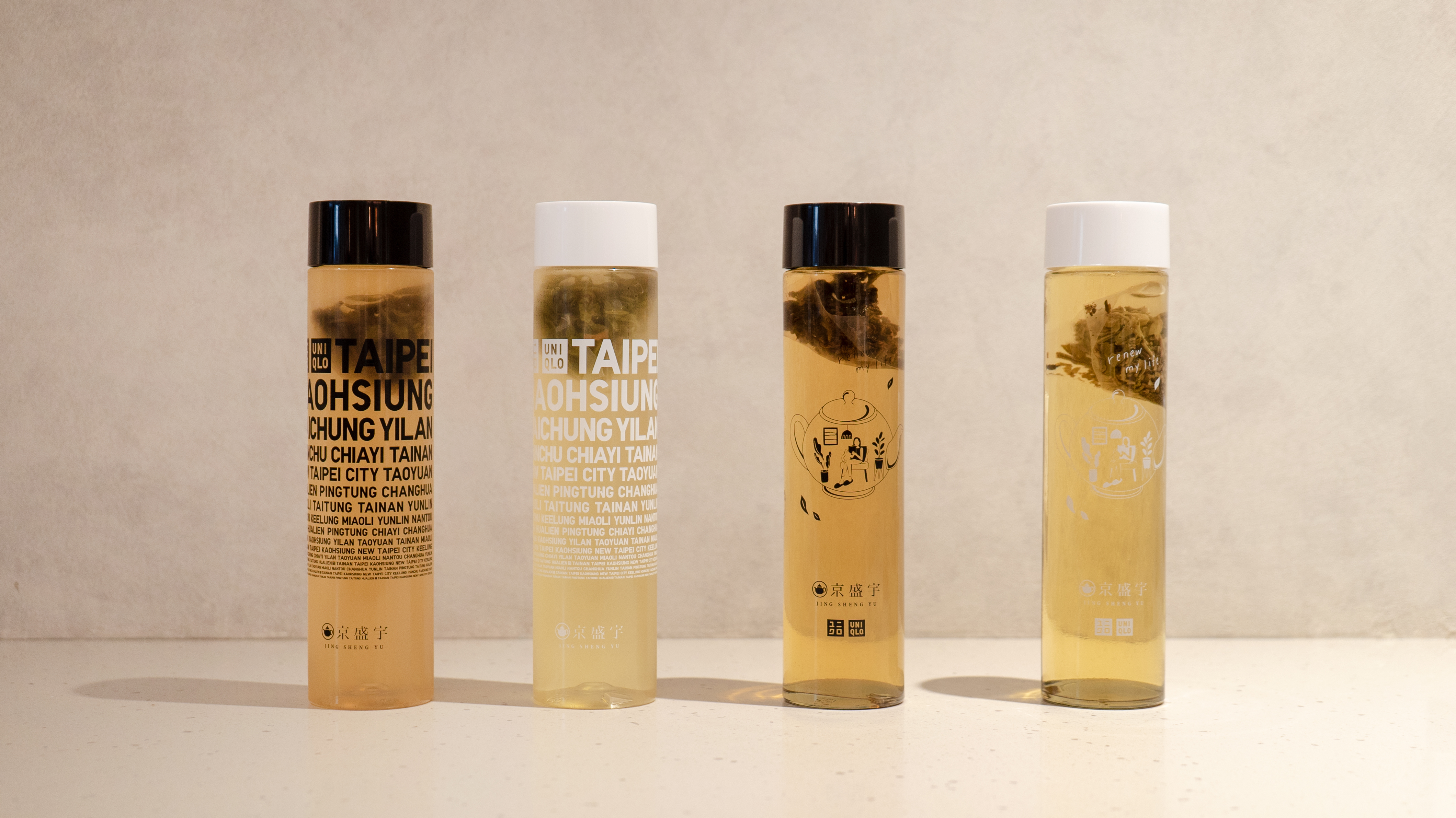 UNIQLO 獨家設計了多款聯名隨身瓶,2款是採經典圖案的「城市瓶」,採PET材質,風味是不知春、鐵觀音;2款是為本次合作專屬設計的「插畫瓶」,採PET材質,風味是蜜香貴妃、輕焙凍頂烏龍,以及於2023年京盛宇世界選茶精選來自於日本人氣茶區,推出兩款全新設計隨身瓶,風味為日本八女煎茶與八女焙茶。以上每瓶均為60元。