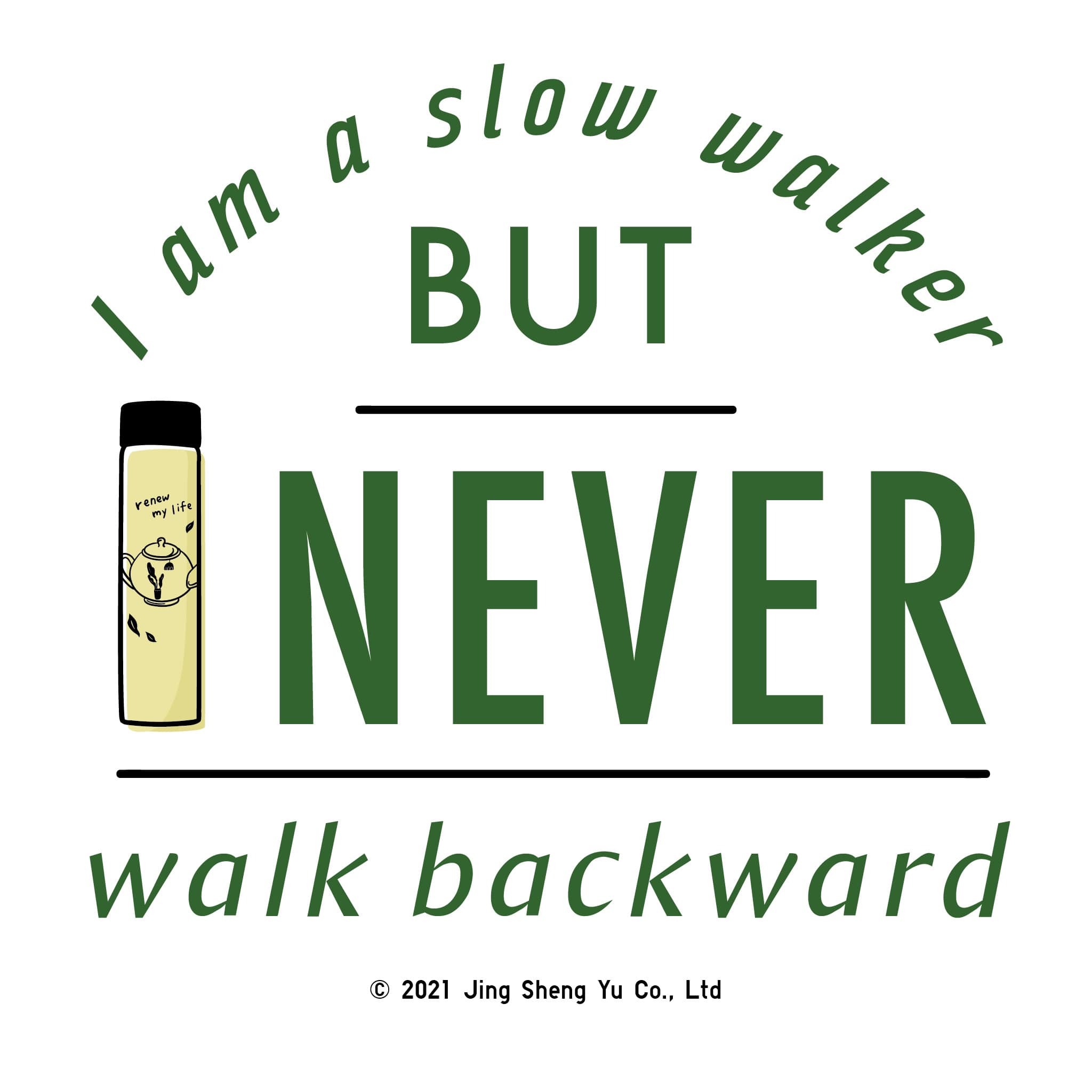 京盛宇曾經在2017年企劃一系列可以傳遞正能量名言,做成貼紙送給大家,當時活動中有一句:I am a slow walker,but I never walk backward. (我走得慢,但我從不退後)這是美國總統林肯的名言,在改變台灣茶這條不易的道路上,這句話一直是支撐著京盛宇內心的動力。