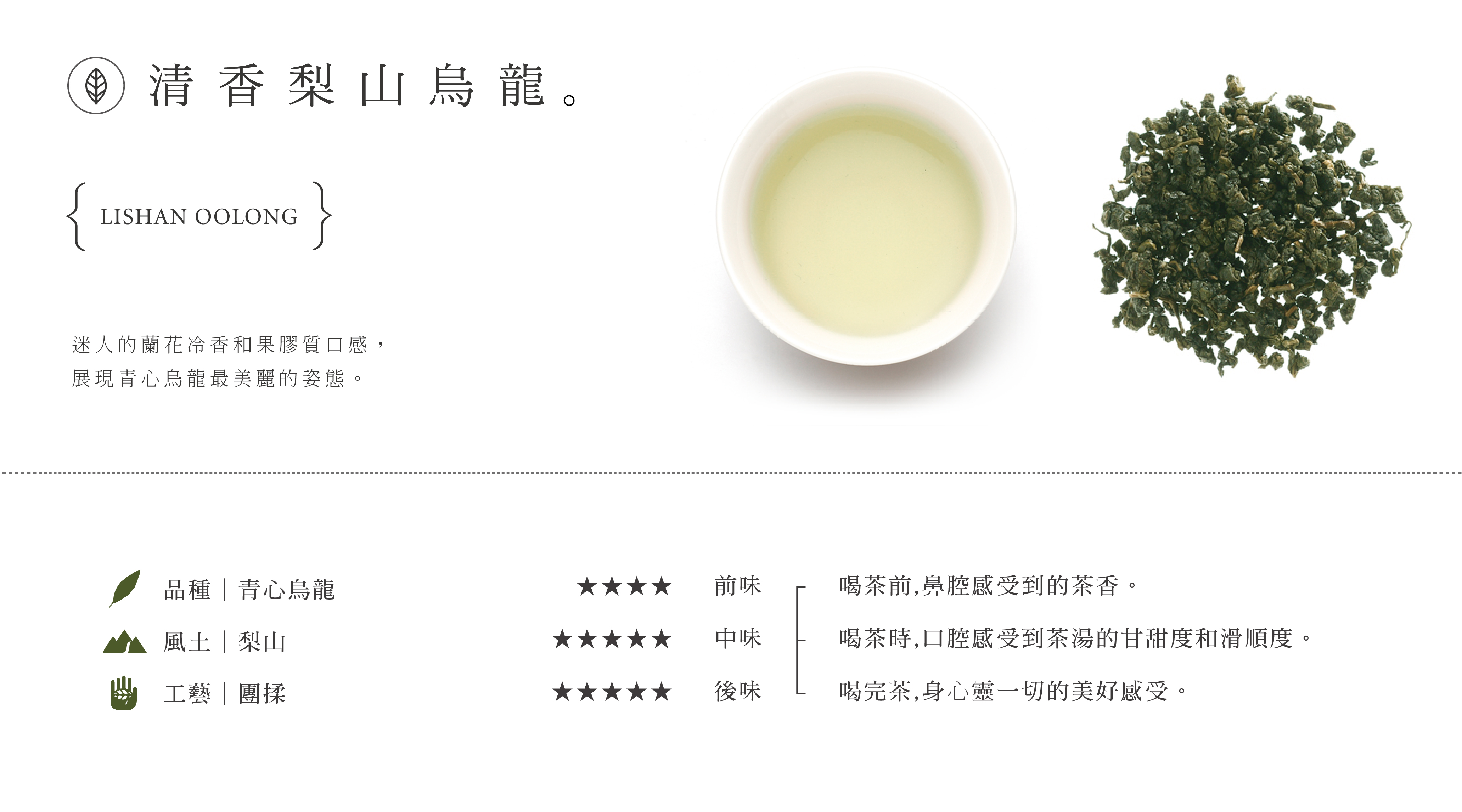 迷人的蘭花冷香和果膠質口感,展現青心烏龍最美麗的姿態。