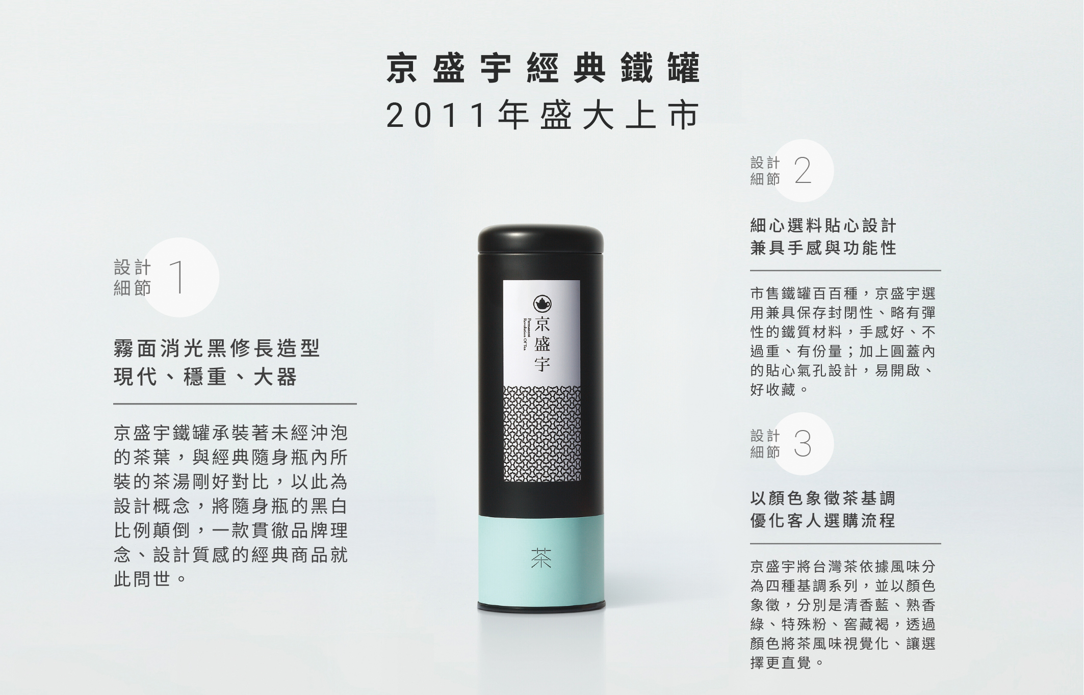 這個經典鐵罐,同時解決了當時遇到的幾個問題:從品牌發展需求來說:第一、設計靈感來自於核心產品隨身瓶,與品牌產生連結,再進行品牌改造、開發新品的時候,不至於太突兀。第二、透過「茶字」、「茶紋」,除了紫砂壺的Logo,可再次強化京盛宇與茶的連結。